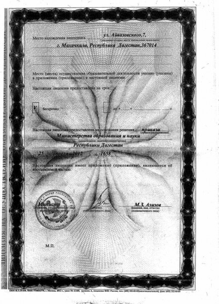 Адрес местонахождения образовательной организации* 367014, Республика Дагеста, г. Махачкала, ул. Айвазовского, д. 7